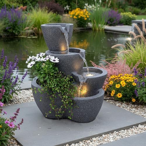 Fontanna z ciepłymi LEDami do pokoju. Możliwość obsadzenia roślinami. Imitacja kamienia na taras. Pompa w komplecie ułatwia użycie. Tworzy spokojny wodospad. Pasuje do ogrodów zimowych. Oświetlenie podkreśla wieczorem. Trwała żywica lekka. Idealna dekoracja balkonowa. Zapewnia relaks w domu.