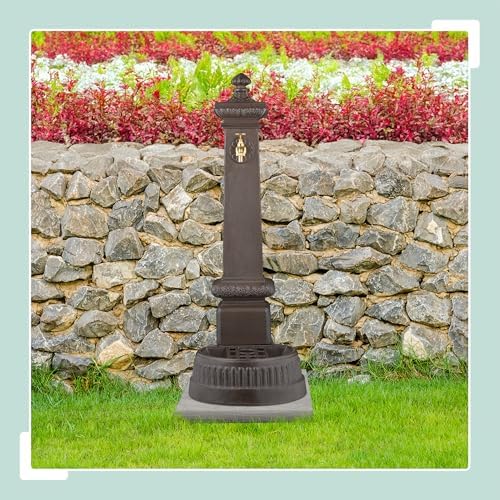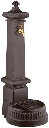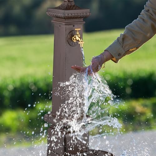 Stojąca fontanna z kranem i umywalką do patio. Wymiary metr wysokości i czterdzieści centymetrów szerokości. Stal i aluminium w kolorze brązu. Tworzy rustykalny akcent ogrodowy. Łatwa w montażu na zewnątrz. Zapewnia praktyczny dostęp do wody. Dekoracyjna dla tarasów. Wytrzymała na pogodę. Dodaje charakteru przestrzeni. Idealna do relaksu.