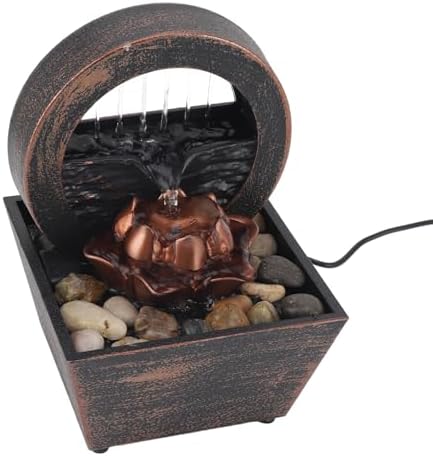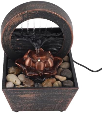 Dekoracyjna fontanna z plastiku na USB pięć woltów. Pasuje do salonu czy biura na biurku. Wymiary około siedemnastu na dwunastu centymetrów. Żółte diody LED oświetlają strumień. Waga pół kilograma ułatwia przenoszenie. Dołączone kamienie i kabel w zestawie. Dodaj wodę i włącz dla efektu. Nieregularne kamyki w pakiecie. Instrukcja obsługi w komplecie. Tworzy spokojną atmosferę w pomieszczeniu.